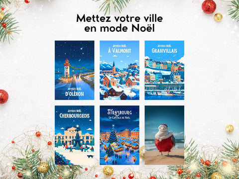 Vous avez un commerce dans une station de ski, un village de montagne, une ville historique ou une station balnéaire ? Nous créons gratuitement le visuel de Noël de votre ville : chalets illuminés, sapins, neige, guirlandes et ambiance festive. Chaque création s’adapte à votre identité locale : nom de la ville, monument emblématique, couleur dominante, tout est personnalisable.