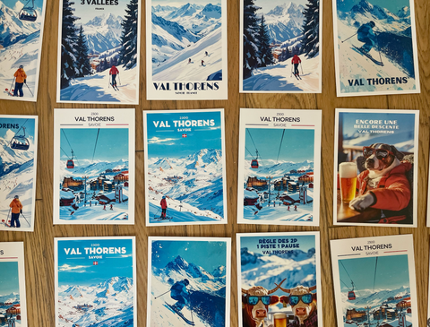 Nous proposons une gamme complète de produits touristiques autour de la montagne et du ski : des visuels illustrés représentant les grandes stations comme Val d’Isère, Les 2 Alpes, L'Alpe d’Huez, Chamonix, La Clusaz, Saint-Lary, Cauterets, Font-Romeu… mais aussi des lieux moins connus à fort charme local.