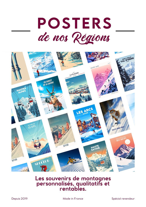 Vous êtes un commerçant en station de ski, responsable de boutique de souvenirs, d’un office de tourisme, d’un magasin de décoration ou d’un concept store en altitude ? Vous cherchez un fournisseur de produits souvenirs autour du ski et de la montagne ? Chez Posters De Nos Régions, nous créons et distribuons des affiches, cartes postales, magnets aux visuels originaux, fabriqués en France, à des prix de gros très compétitifs.
