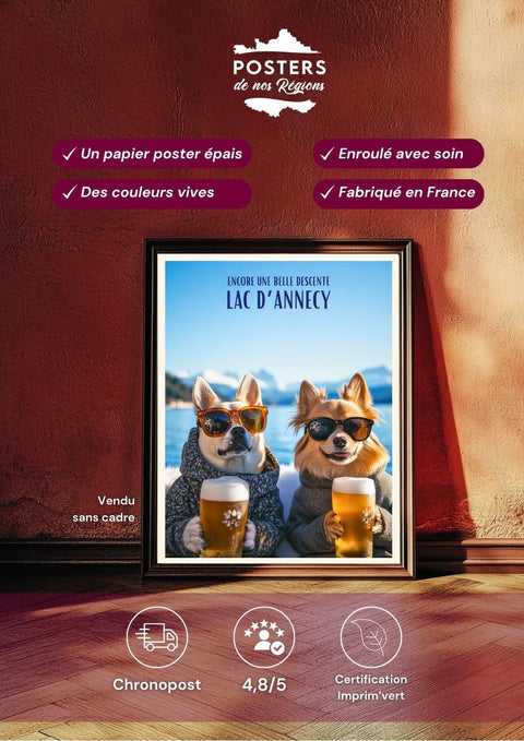 Plongez dans l'atmosphère festive et amusante de l'Annecy avec cette affiche humoristique qui célèbre les plaisirs de la descente ! Avec un chien en vedette, cette œuvre d'art capte parfaitement l'esprit de camaraderie et de bonne humeur que l'on ressent entre amis. Imaginez-vous en train de savourer un verre de bière après une belle journée sur les pentes.