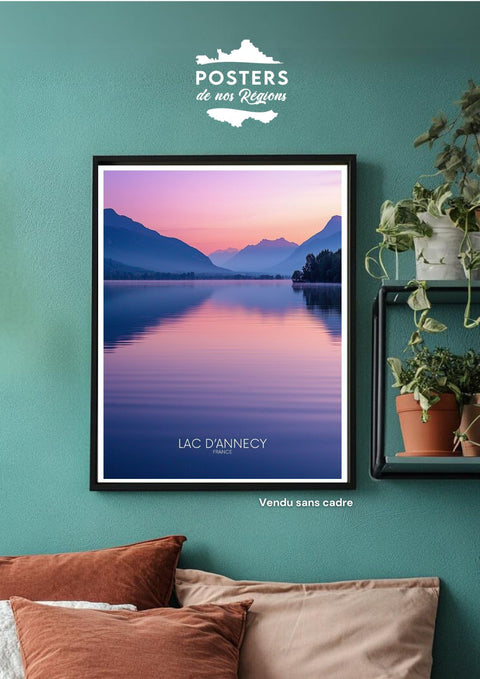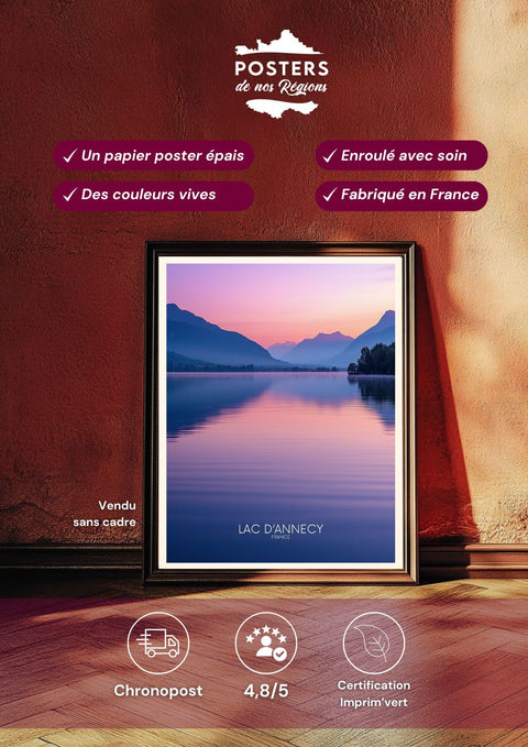 Ce poster du lac d'Annecy apporte une ambiance de calme et de sérénité à n'importe quel espace. Il évoque la beauté simple et pure d'un coucher de soleil sur l'un des plus beaux lacs de France. Un choix idéal pour une déco murale élégante et intemporelle.