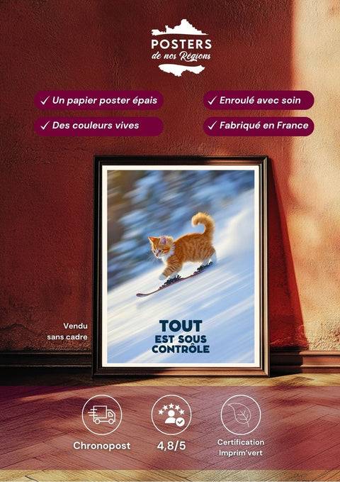 Plongez dans l'univers amusant de l'affiche humoristique avec cette illustration irrésistible d'un chat en pleine action de ski. Avec son air complètement serein et sa légende humoristique "Tout est sous contrôle", ce poster ajoute une touche de légèreté et de fun à toute décoration murale. Le chat mignon semble avoir tout parfaitement maîtrisé, même les pistes les plus délicates.