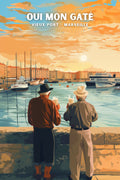 Inspirée par les moments de convivialité au Vieux Port de Marseille, cette affiche "Oui Ma Gatée" illustre deux vieux amis partageant un moment de joie avec l'inscription "oui ma gatée". Ce poster vintage est parfait pour ajouter une touche nostalgique et chaleureuse à votre décoration murale. Découvrez vite l'affiche!