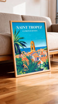 Plongez dans l’atmosphère ensoleillée de Saint-Tropez avec cette magnifique affiche rétro. Inspirée du style vintage des anciennes affiches touristiques, elle met en valeur le charme intemporel de ce village emblématique de la Côte d’Azur. Entre son port animé, ses voiliers élégants et ses façades colorées, cette illustration capture l’essence même de la douceur de vivre tropézienne.