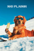 L'Affiche Ski Plaisir Champagne Luxe Drôle Chien capture l'essence de la vie de luxe à travers une illustration vibrante. Imaginez un chien, personnage principal de cette œuvre, qui dévale audacieusement les pistes de ski, tout en tenant un verre de champagne, symbole suprême du raffinement. Cette scène originale et drôle évoque à la fois l'excitation du ski et la joie des moments de célébration.