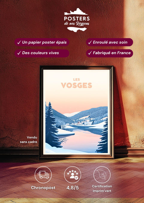 Ce poster vintage capture l'authenticité des paysages vosgiens, où les montagnes majestueuses, les forêts enneigées et les hivers froids offrent un spectacle naturel impressionnant. Parfait pour une déco murale à la fois rétro et esthétique, ce poster s'inspire des vues emblématiques des Vosges, telles que celles de Vittel ou d'Epinal. Offrez à votre intérieur une touche d'évasion et de nature grâce à cette affiche élégante et évocatrice des charmes de l'hiver vosgien.