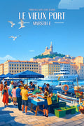 Cette affiche représente l’une des vues les plus emblématiques de Marseille, avec le Vieux-Port en premier plan et la majestueuse Notre-Dame de la Garde dominant la ville. L'illustration vibrante capture le mouvement des bateaux dans le port, tout en offrant une perspective unique sur les bâtiments de la ville et la mer Méditerranée qui les entoure. Un poster parfait pour les amoureux de Marseille et des paysages marins.